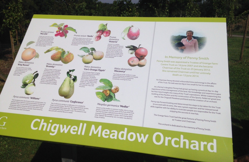 On 22nd August 2015, a memorial for former Conservative Councillor Penny Smith was unveiled by her daughter at Grange Farm Centre in Chigwell. Cllr Smith was a trustee of the Grange Farm Trust and was Chairman until her untimely passing in June 2014.